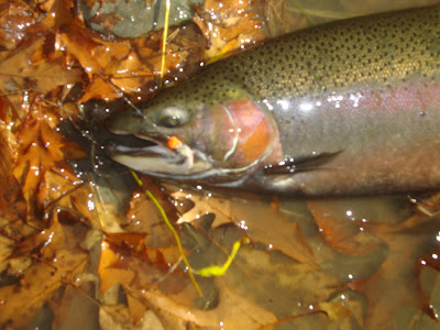 I rigged up a tandem sucker spawn combination and attempted to entice a strike of the many steelhead in the pool and tail out. I spent the first hour or so drifting tandem combinations of sucker spawn and nymph’s to no avail. The other two guys weren’t having any strikes either. I don’t give up too easily and always figured that there got to be one that can be fooled but so far the local steelhead appeared to be leery and too smart for us. It was time to show them something different.
